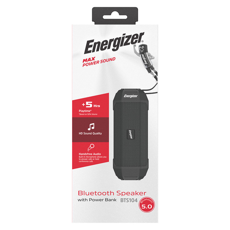 اسپیکر بلوتوث انرجایزر مدل BTS104 شرکت Energizer انرژی خود را از یک باتری داخلی 1500 میلیآمپرساعتی تأمین میکند. مدت زمان پخش موسیقی در این محصول تا 5 ساعت با حداکثر صداست. توان خروجی این محصول نیز 5 وات است و با توجه به آن توانایی پخش صدای با کیفیتی را داراست.